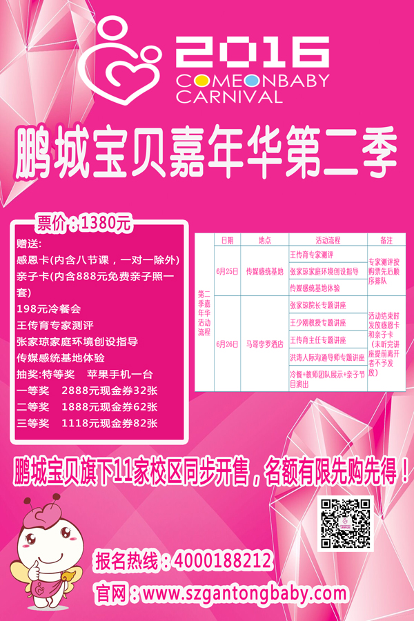 日程安排: 6.25 王傳育專(zhuān)家測(cè)評(píng) 張家瓊家庭環(huán)境創(chuàng)設(shè)指導(dǎo) 傳媒感統(tǒng)基地體驗(yàn) (上述服務(wù)以購(gòu)票先后順序?yàn)闇?zhǔn)) 6.26 臺(tái)灣王傳育博士、重慶張家瓊院長(zhǎng)、 香港王少剛教授、深圳洪濤專(zhuān)題講座 冷餐會(huì) 發(fā)放感恩卡和親子卡(未聽(tīng)完當(dāng)日講座者不發(fā)放感恩卡及親子卡) 抽大獎(jiǎng) 教師團(tuán)體展示 親子節(jié)目精彩呈現(xiàn) 鵬城旗下11家校區(qū)同步開(kāi)售,會(huì)員家長(zhǎng)可以直接到前臺(tái)或咨詢主班老師,名額有限,先報(bào)先得。 報(bào)名方式: 官網(wǎng)報(bào)名:m.fl-coupling.cn 微信平臺(tái):關(guān)鵬城寶貝微信平臺(tái),回復(fù)“嘉年華”即可報(bào)名 QQ:2569755634 報(bào)名熱線:4000188212 福田梅林校區(qū): 深圳市福田區(qū)下梅林梅亭路2-16號(hào)/龍尾社康旁 福田景田校區(qū): 深圳市福田區(qū)蓮花路怡楓園C棟208 南山桃源校區(qū): 深圳市南山區(qū)龍珠大道桃源村95棟一至二樓 南山后海校區(qū) 南山區(qū)招商?hào)|路后海理想雅園全球鷹國(guó)際教育城3001 龍華新區(qū)上河坊中心: 龍華新區(qū)民治街道梅林關(guān)口書(shū)香門(mén)第上河坊購(gòu)物樂(lè)園1018鋪 龍華星河校區(qū): 龍華新區(qū)民治街道梅林關(guān)口豐澤湖山莊會(huì)所一至二樓 傳媒感統(tǒng)教研基地: 深圳市彩田北路星河丹堤101--102號(hào)商鋪 龍崗中心校區(qū): 龍崗中心城龍福西路96號(hào)羅馬公元一樓優(yōu)優(yōu)島 布吉信義校區(qū): 深圳市龍崗區(qū)布吉信義荔山公館7號(hào)樓一樓商鋪(包商銀行旁邊) 寶安第五大道校區(qū): 寶安區(qū)第五大道(高發(fā)西岸花園)商業(yè)內(nèi)街N125、N126、N127號(hào) 寶安寶立方校區(qū): 寶安區(qū)新安四路寶立方博覽中心二樓 |